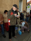 Während Gunter Demnig einen Stein verlegt, stellt Gerrit Rippen (Patenschaft Bündnis90 / Die Grünen) das Schicksal