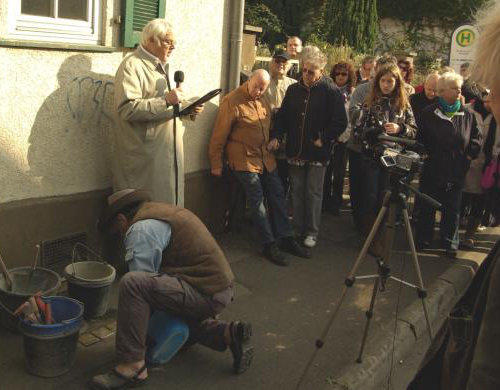 Während Gunter Demnig zwei Steine verlegt, stellen Paten der Stolpersteine, das Schicksal von Isidor Kahn und Bella