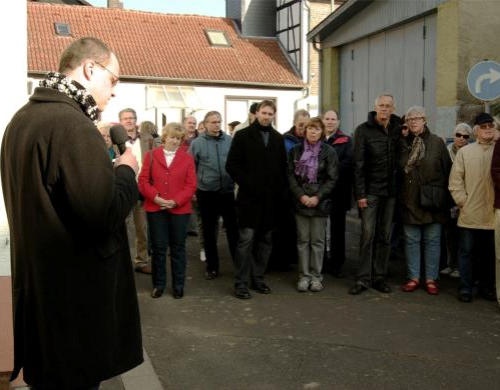 Während Gunter Demnig drei Steine verlegt, stellt Pfarrer Sven Hebisch, einer der Paten der Stolpersteine, das Schicksal
